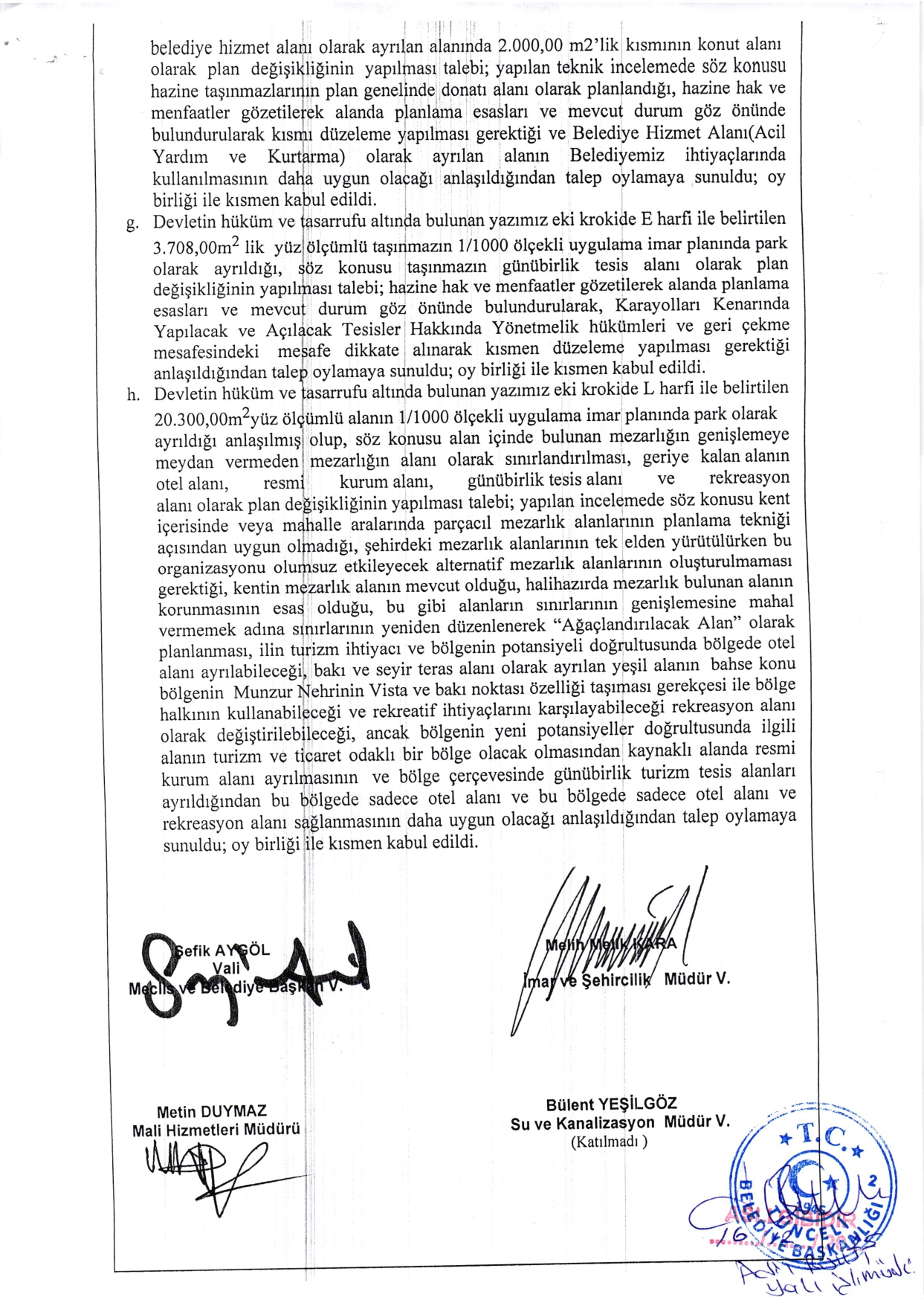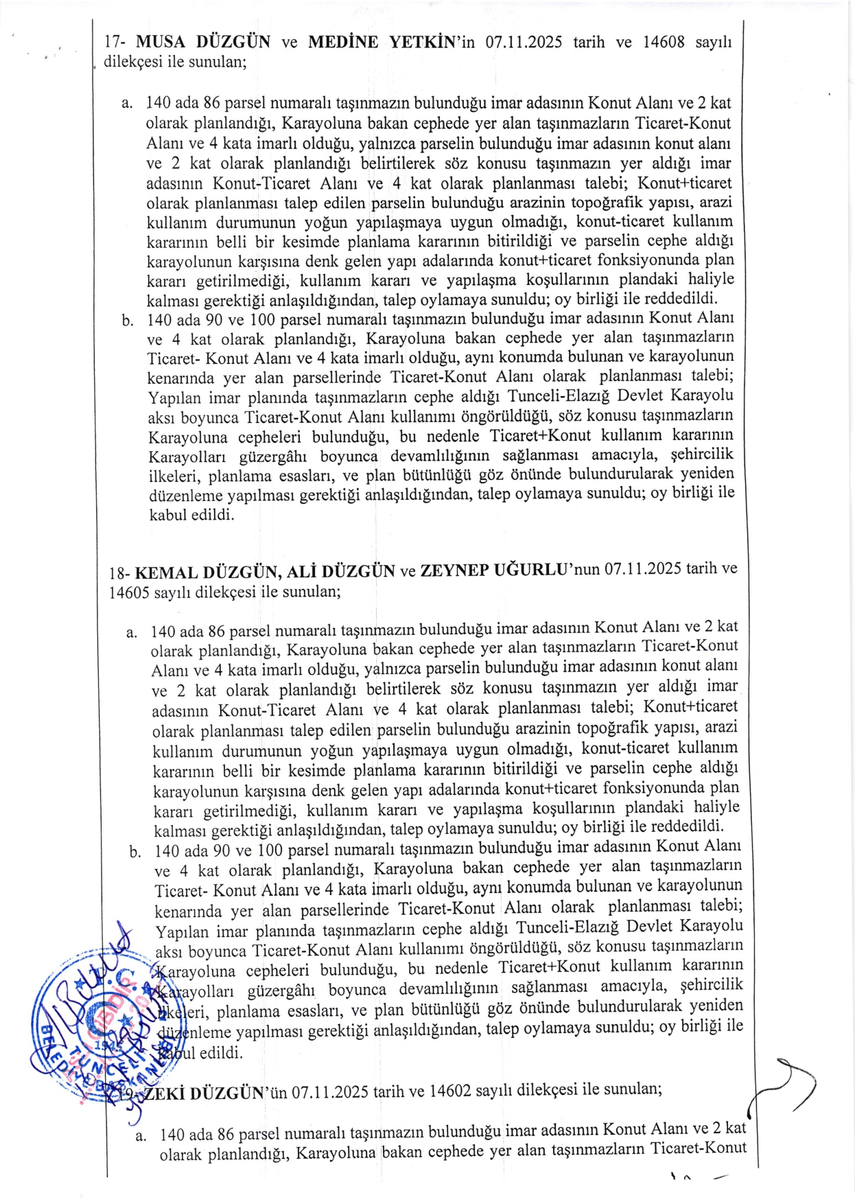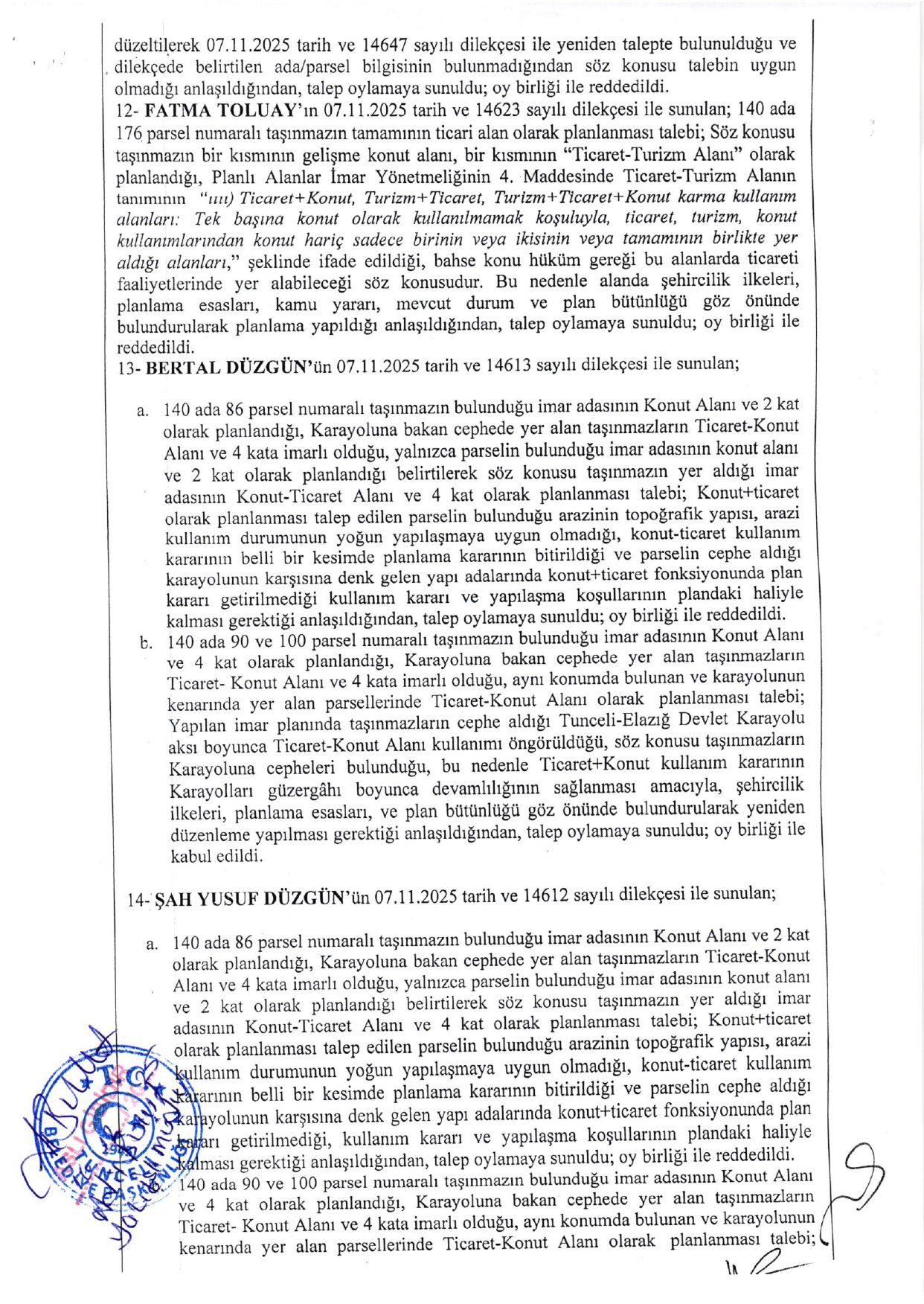 İlimiz Merkez İlçe, Aktuluk Mahallesinin bir kısmını kapsayan alanda yapılan, sınırları paftasında belirtilen “Aktuluk Mahallesi (Yol Altı) 1/5000 Ölçekli Nazım İmar Planı ve 1/1000 Ölçekli Uygulama İmar Planı” Tunceli Belediye Meclisinin 30.09.2025 tarih ve 2025/102 sayılı kararı ile onaylanarak, 10.10.2025-10.11.2025 tarihleri arasında 1 (bir) ay süre ile askıya çıkarılmıştır. Söz konusu askı süresi içerisinde yapılan itirazlar Tunceli Belediye Meclisinin 03.12.2025 tarih ve 2025/137 sayılı kararı ile görüşülerek karara bağlanmış olup, ilgi planlara yapılan itirazlar sonucunda Belediye Meclisince kabul edilen kısımlar, 3194 Sayılı İmar Kanunu’nun 8/b maddesi ve Mekânsal Planlar Yapım Yönetmeliğinin 33/6. maddesi gereğince, 1 (bir) ay askıda kalmak suretiyle 12.01.2026 tarih Pazartesi günü saat 08:00’da başlamak üzere, Tunceli Belediyesi Hizmet Binası girişindeki ilan panosunda askıya çıkartılmış olup, eş zamanlı olarak Belediyemizin resmi internet sayfasında (www.tunceli.bel.tr) ve ilgili mahalle muhtarlıklarında ilan edilmiştir. Askıdaki imar planlarına itirazın olması durumunda 12.02.2026 tarih Perşembe günü saat 17:00’a kadar Tunceli Belediyesi İmar ve Şehircilik Müdürlüğüne yazılı müracaatta bulunmanız gerektiği ilgililere ilan olunur.12.01.2026